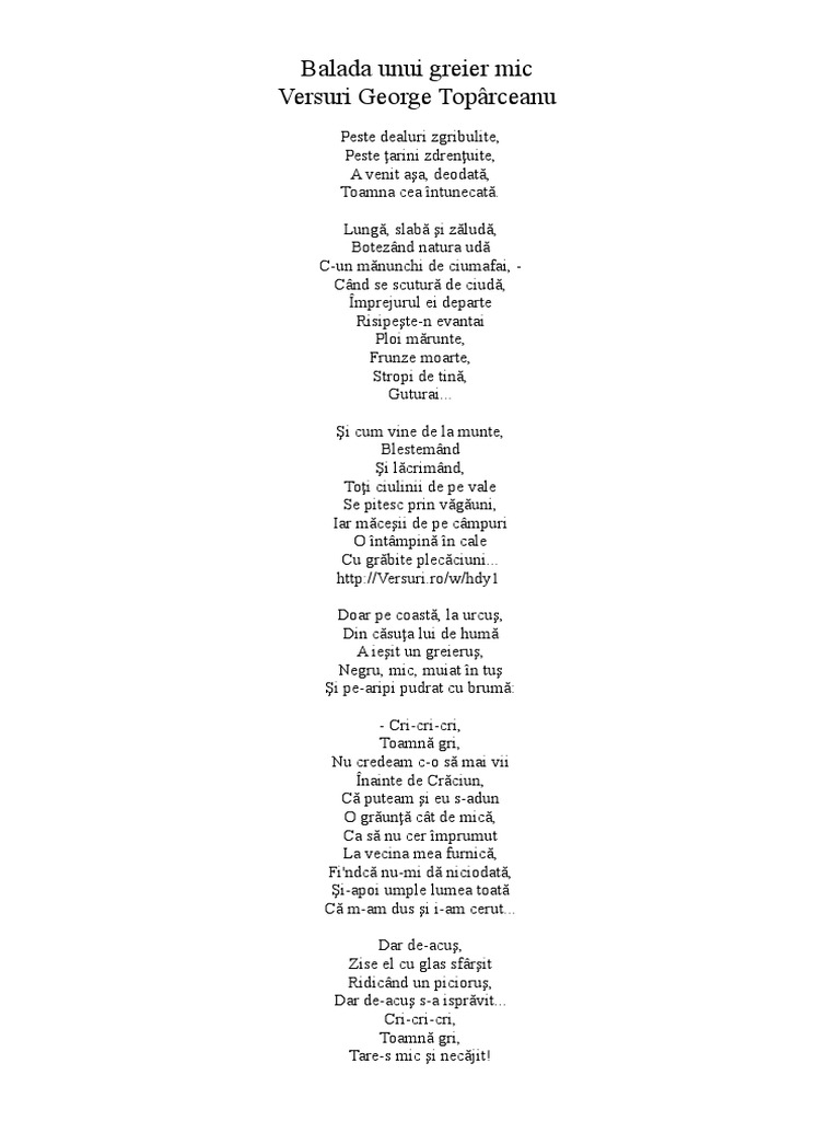 Versuri George Toparceanu Balada Unui Greier Mic Lyrics Versuri Us