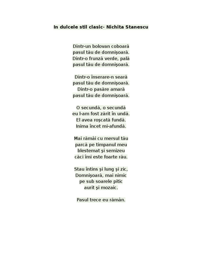 Nichita Stanescu In Ducele Stil Clasic Txt