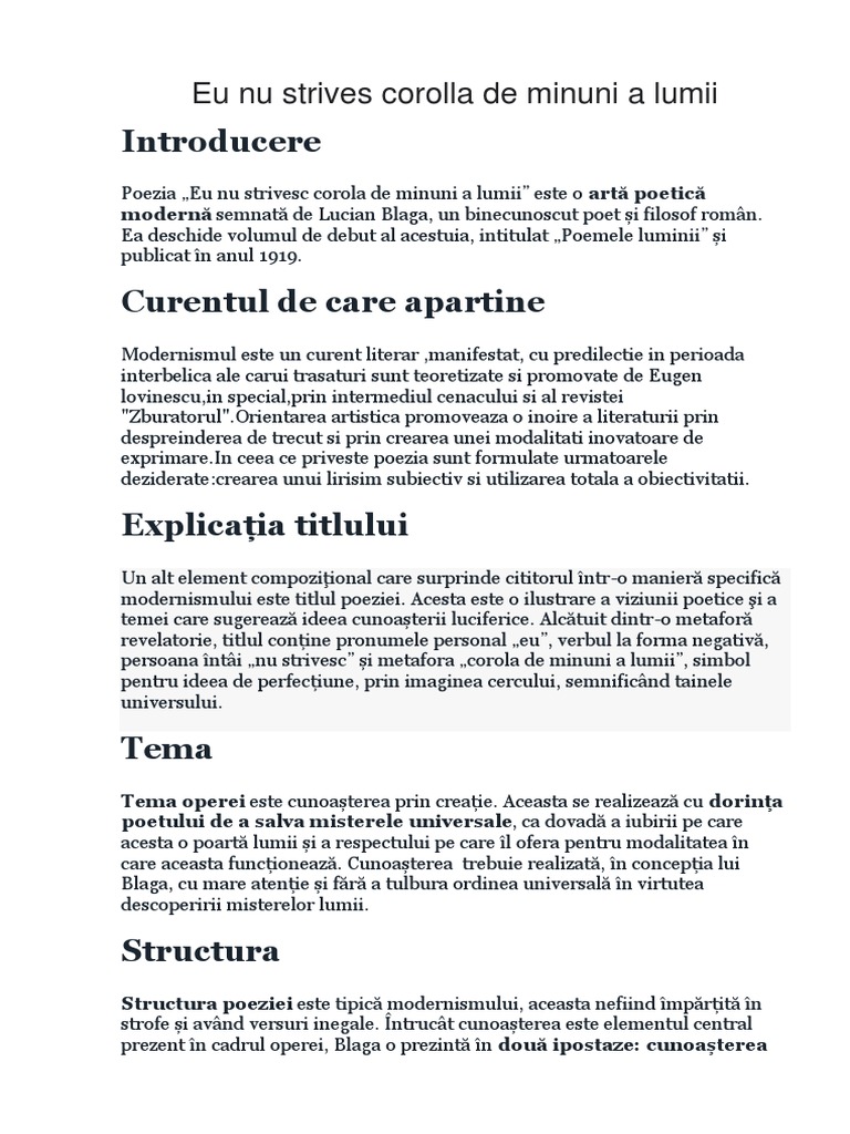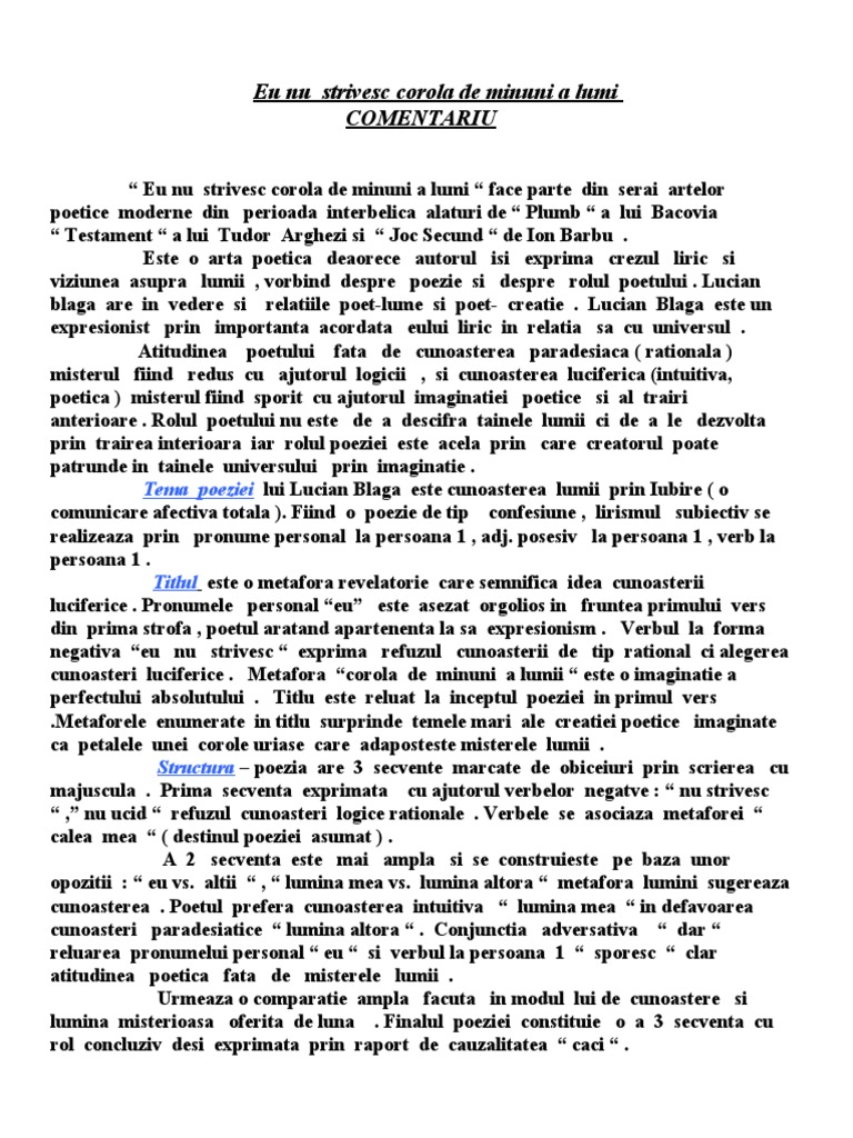 Doc Eu Nu Strivesc Corola De Minuni A Lumii Comentariu Bac