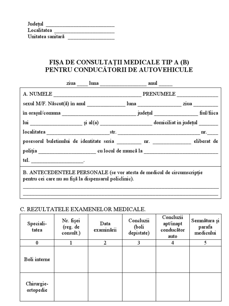 Oftalmologie orl ortopedie medicina interna neurologie si. Fisa medicala permis auto in regim de urgenta de la 145 lei. Fisa medicala pentru obtinerea permisului de conducator auto se elibereaza in aceeasi zi. Fisa de consultatii medicale tip a b pentru conducatorii de autovehicule author.